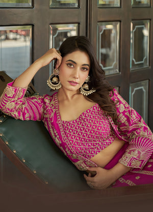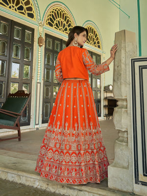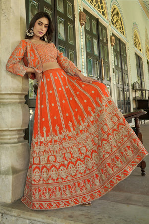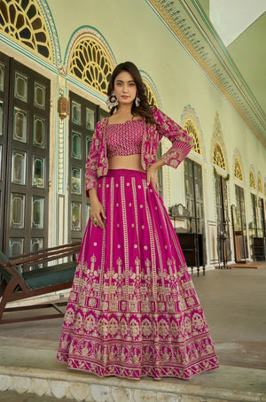 A regal blend of tradition and trend, this embroidered Chinon lehenga set is perfect for modern celebrations with timeless flair.