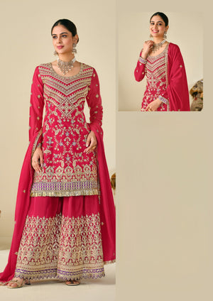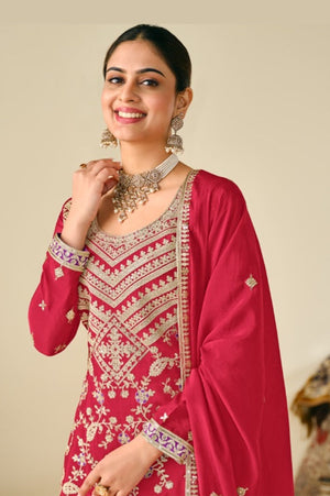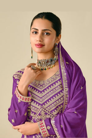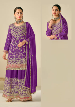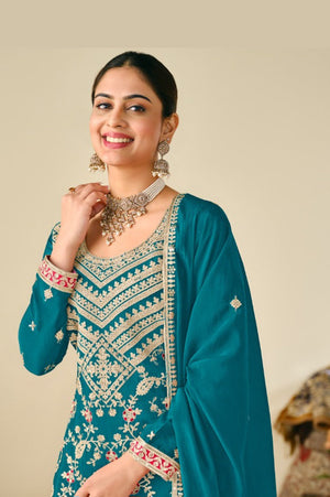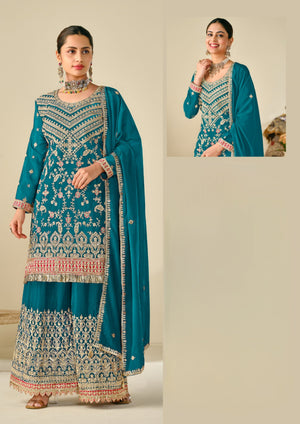 Crafted from luxurious Premium Chinon, this three-piece ensemble is a symphony of elegance and craftsmanship. With ornate embroidery, a dramatic flared kali-style plazo, and a richly worked dupatta, Zarqa Elegance is ideal for festive evenings and graceful gatherings.