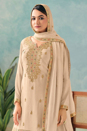 Dupatta: The Premium Chinon Dupatta is lightweight and elegant, perfectly complementing the embroidery work on the top and sharara.