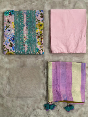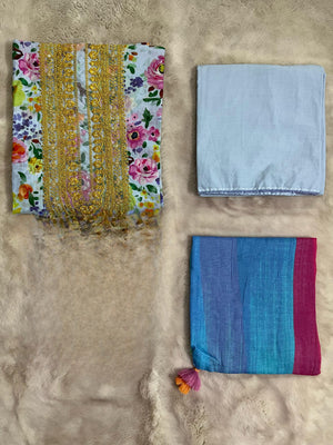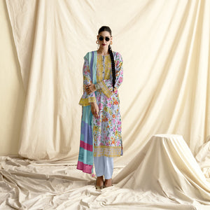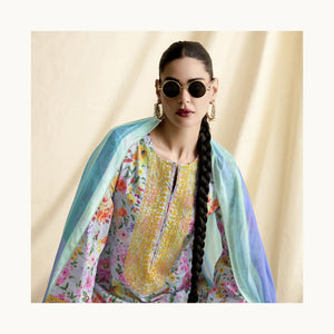 This elegant suit set is crafted in pure lawn, beautifully adorned with a digital print and detailed resham embroidery at the neckline. Delicate crochet lace insertions and scalloped crochet borders on the hemline and sleeves elevate the design with a handcrafted charm. The set is paired with a breathable pure cotton bottom for all-day comfort. Completing the look is a pure bamber mulmul dupatta with digital print and a graceful four-side scalloped crochet border—perfect for effortless daytime elegance.