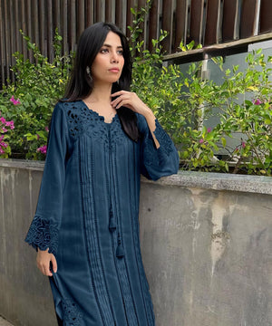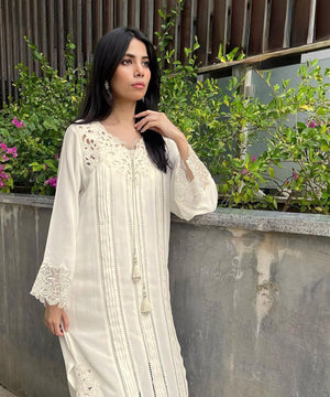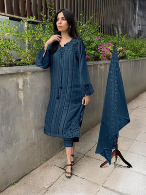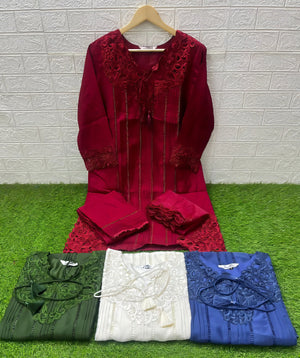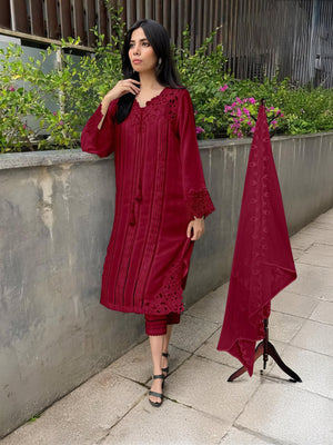 This designer tunic is adorned with gorgeous heavy embroidery, intricate cutwork, and elegant plated detailing on the top. The sleeves are beautifully embroidered with matching cutwork accents, enhancing the overall glam look. Paired with coordinating velour slub pants and a rich embroidered organza dupatta, this set is crafted for graceful festive appearances.