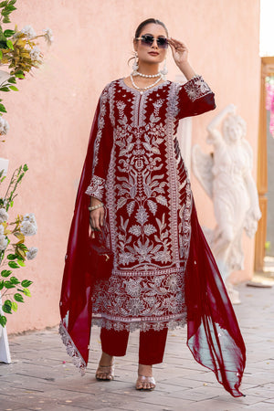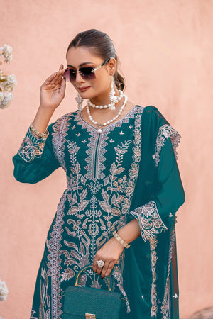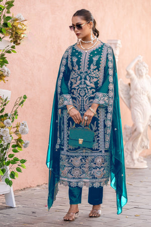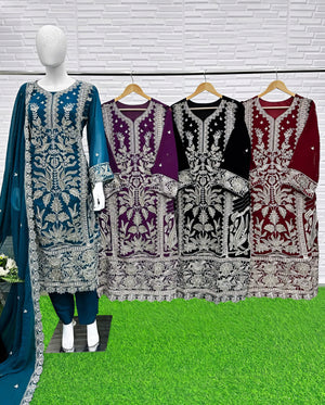 Part of our Luxury Pret Collection, this designer tunic set features a finely crafted top with delicate Khatli handwork and stylish embroidery on the sleeves. The attractive neckline adds charm to the silhouette. It is paired with a fancy dull santoon pant and a heavy embroidered fox georgette dupatta, offering superior quality at an affordable price.