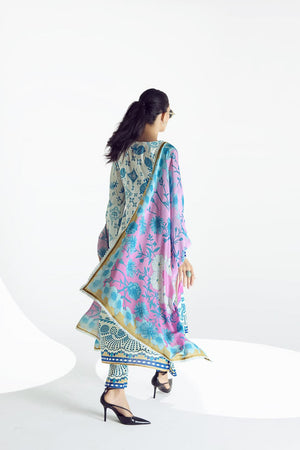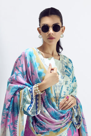 Dupatta: Crafted in airy Pure Bamber Mulmul, the dupatta is adorned with matching digital prints and finished with scalloped lace edges, adding a touch of graceful fluidity.