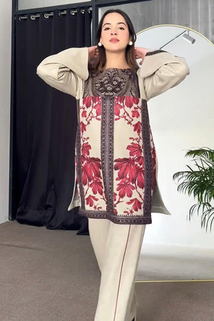 This chic and easy-to-style co-ord set is tailored from pure natural crepe fabric featuring elegant digital prints. The top comes with sleeves and has a length of 35-36 inches, giving a polished yet comfortable feel. It is paired with matching plazzo pants, stitched with an elasticated waist for ease of wear. With no dupatta included, this set is ideal for those who prefer a modern, fuss-free look.