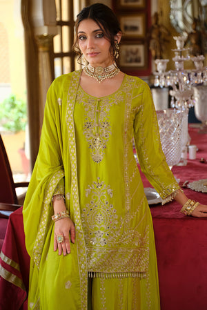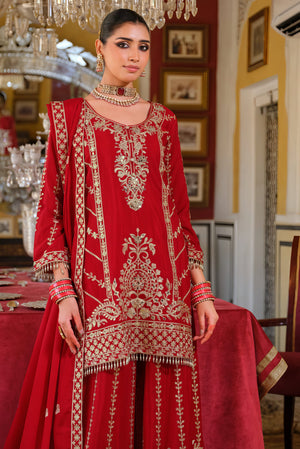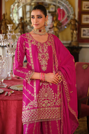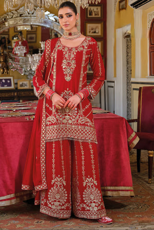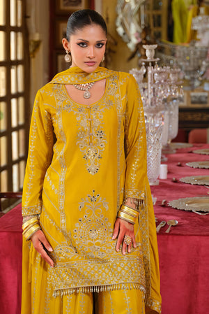 This designer sharara set is tailored from luxurious premium chinnon silk, offering a smooth texture and rich sheen. The top, crafted in fine chinnon silk, exudes timeless elegance, while the flowing sharara bottom adds volume and a statement appeal. Completing the ensemble is a matching chinnon silk dupatta that enhances the outfitâs refined charm. Designed with finesse, this sharara set is the perfect blend of sophistication and tradition, making it an ideal choice for grand occasions.