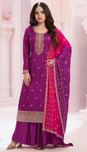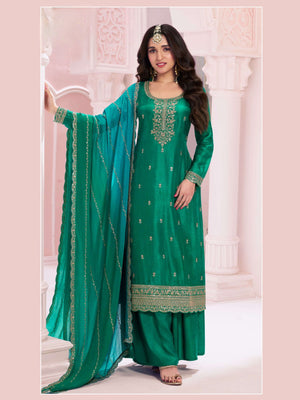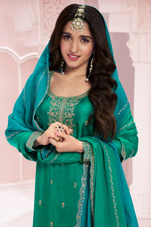 - Top: Designed in rich Vichitra fabric, the top features exquisite zari and thread embroidery work, accentuated with delicate sequin highlights that add just the right touch of shimmer. Comes with full sleeves for a regal finish.