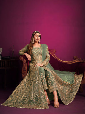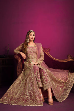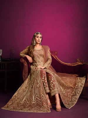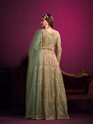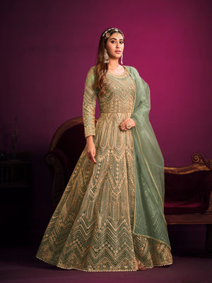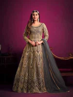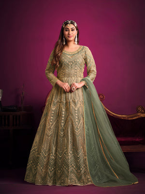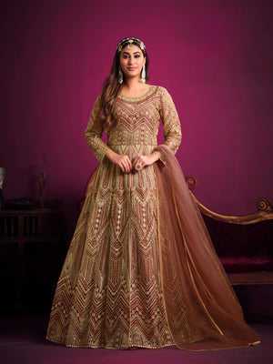 A delicate and festive ensemble crafted with embroidered net, designed to make you glow with grace and elegance.