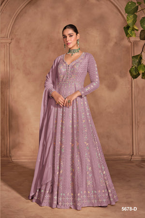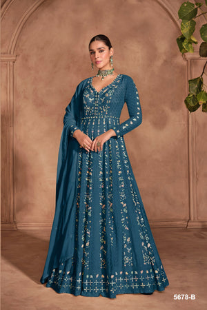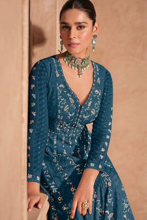 Step into festive flair with this beautifully crafted Heavy Chinon gown set, featuring intricate embroidery and sequin work, finished with a graceful four-side lace dupatta — perfect for weddings, parties, and traditional celebrations.