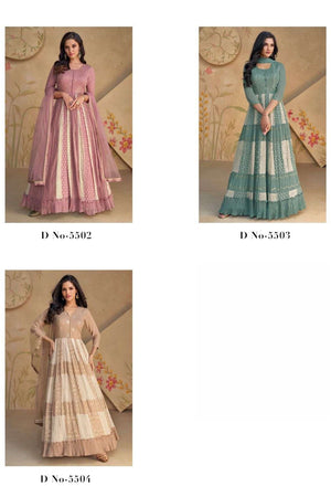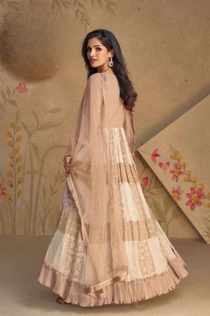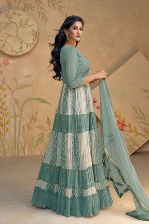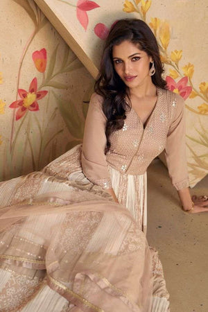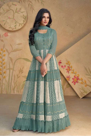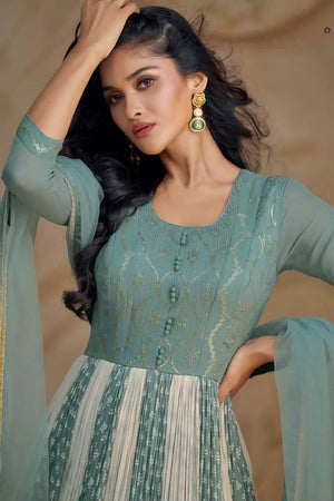 A perfect blend of delicate print and embroidery, this fox georgette set is designed to make you stand out with grace.