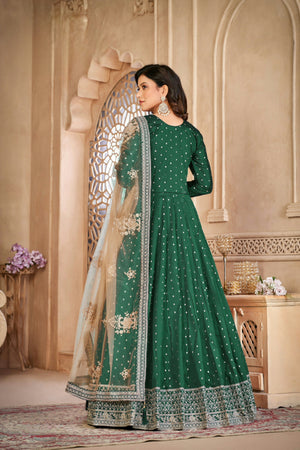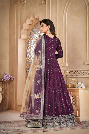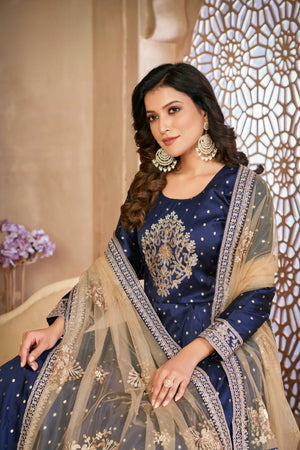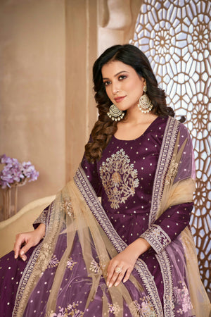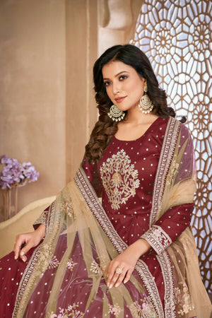 A graceful fusion of texture and tradition—this taffeta butti suit set with delicate embroidery and a soft net dupatta is perfect for refined festive moments.