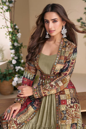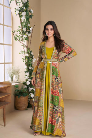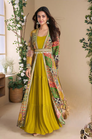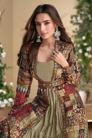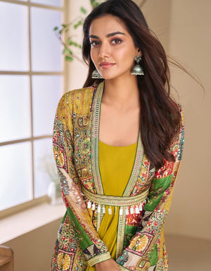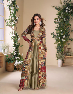 This premium outfit showcases a flowy base made from real georgette, offering comfort and grace in equal measure. It is paired with a stunning shrug crafted from real silk, beautifully hand-embellished with intricate embroidery that adds a luxurious, designer edge. The combination of rich fabrics and detailed craftsmanship makes this ensemble perfect for standout occasions.