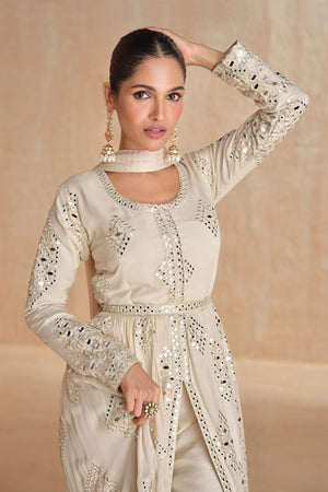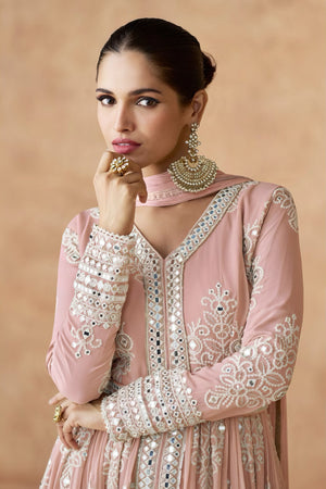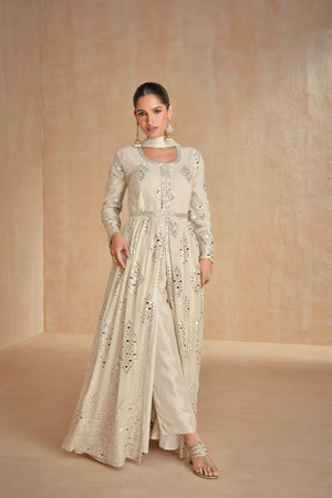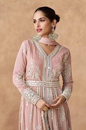 This fully stitched gown set features a luxurious real georgette top adorned with detailed embroidery and sequin work, creating a rich and elegant appeal. The flowy Anarkali-style silhouette enhances the regal charm, while the dyed premium silk bottom offers comfort and sophistication. The look is completed with a soft, lightweight chinnon dupatta, designed with subtle embroidery or borders for a graceful drape. Perfect for grand celebrations with an understated royal flair.