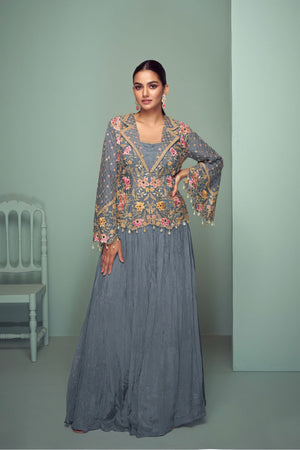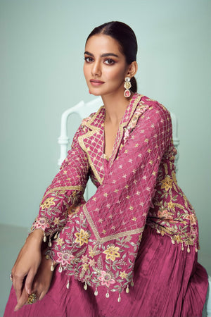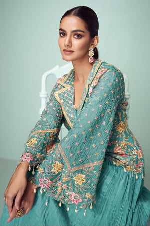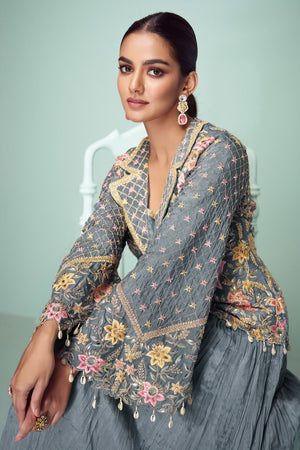 This fully stitched ensemble features a graceful top crafted in luxurious real chinon fabric, adorned with elegant embroidery and sequin detailing for a refined festive look. It is paired with a matching real chinon flared skirt that offers both flow and comfort. Completing the set is a real chinon dupatta with intricate embroidered borders, adding the perfect finishing touch to this elegant outfit.