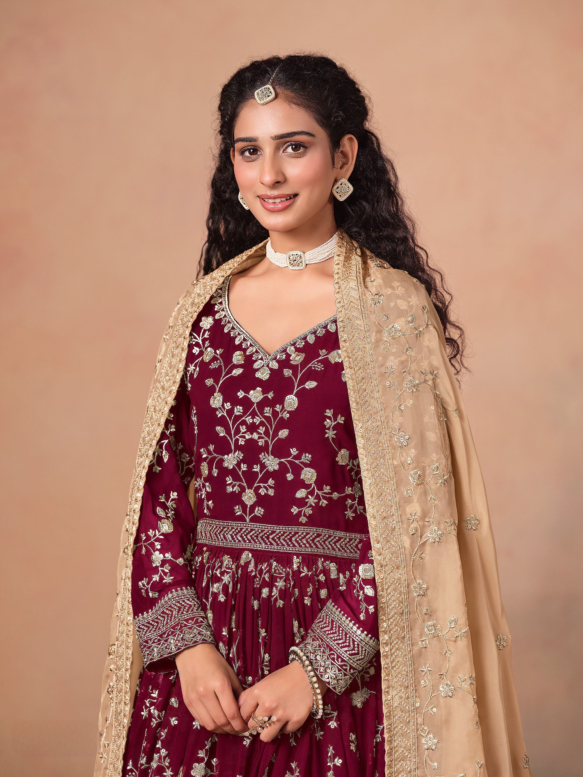 This elegant set features a top crafted in soft faux georgette for a lightweight and comfortable feel. It is paired with a dull santoon bottom/inner for smooth wear and a structured silhouette. The ensemble is completed with a soft organza dupatta, adding a delicate and graceful touch, making it perfect for festive and traditional occasions.