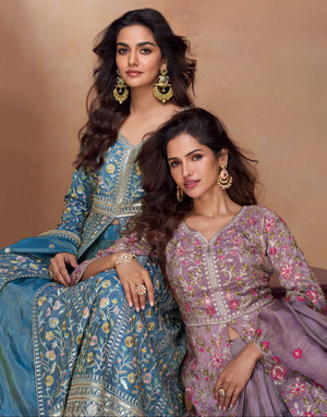 This outfit features a luxurious Pure Viscose Silk top paired with a delicate Real Net dupatta. The rich fabric combination creates a graceful and elegant look, perfect for festive and special occasions.