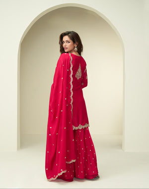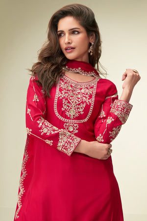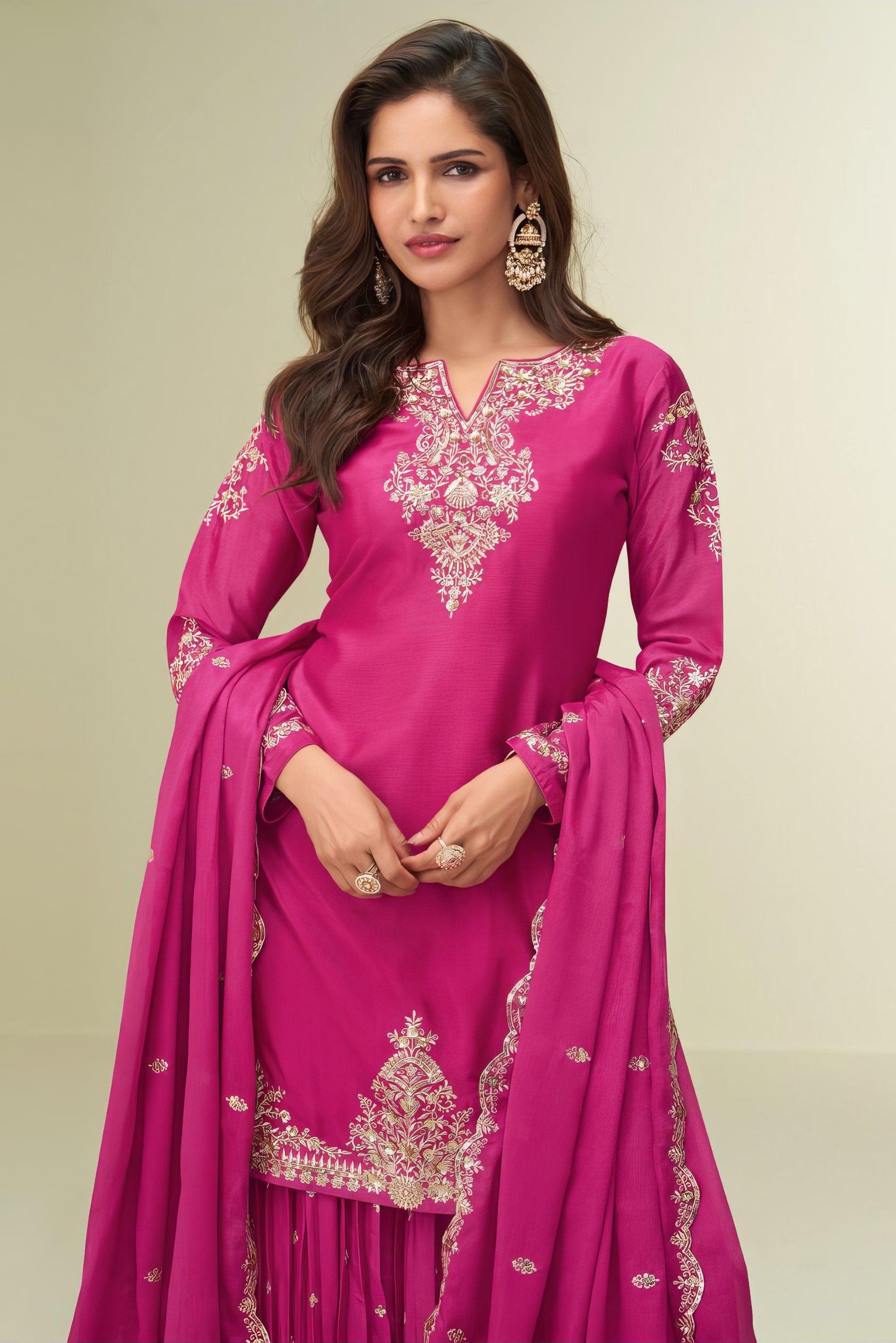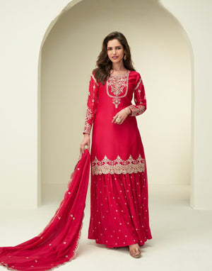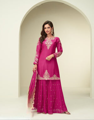This set is crafted from luxurious Premium Chinnon Silk, offering a graceful drape and soft texture. The top and bottom feature the same premium quality fabric for a coordinated look, paired with a matching Chinnon dupatta to complete the ensemble.