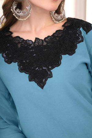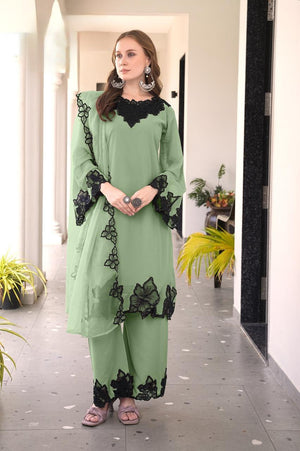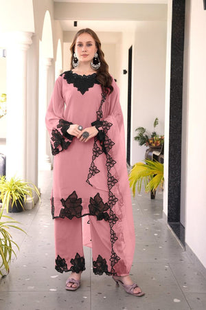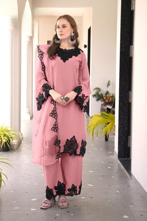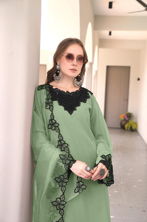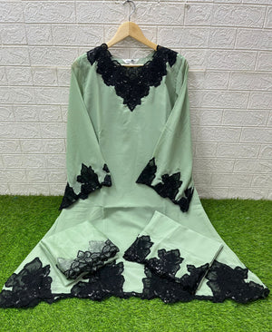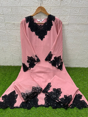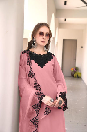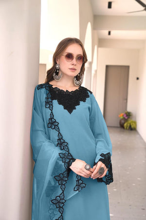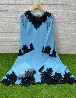 This designer-style frock tunic showcases classic heavy cutwork embroidery on both the front and back, paired with a graceful neckline pattern. The kurti features a flared frock silhouette and glamorous cutwork-embroidered sleeves. It is styled with matching fox fabric plazo pants featuring embroidery and cutwork detailing, and an elegant organza dupatta with embroidery to complete the luxurious look.