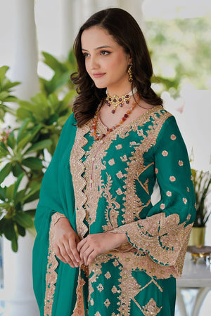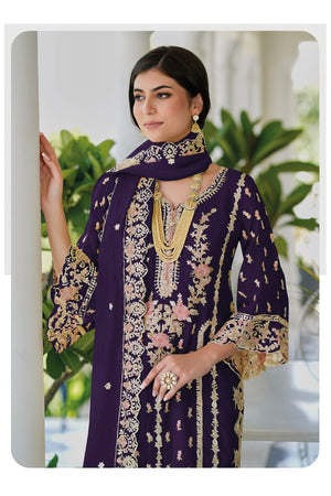 This elegant Pakistani suit features a beautifully crafted Soft Organza top adorned with delicate floral embroidery, bringing out a timeless charm. It is paired with a luxurious Heavy Silk bottom that adds richness to the overall look. The matching Soft Organza dupatta with elegant embroidery completes the ensemble, making it a graceful choice for refined occasions.