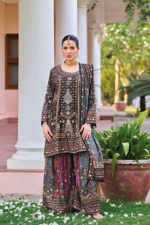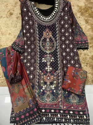This designer set is crafted from premium Chinon digital print silk, featuring exquisite handwork on the top and embroidered sleeves for a luxurious look. The matching bottom is also adorned with embroidery, perfectly complementing the full-stitched top. The ensemble is completed with a premium Chinon digital print dupatta, creating an elegant and stylish outfit suitable for festive occasions, weddings, and parties.