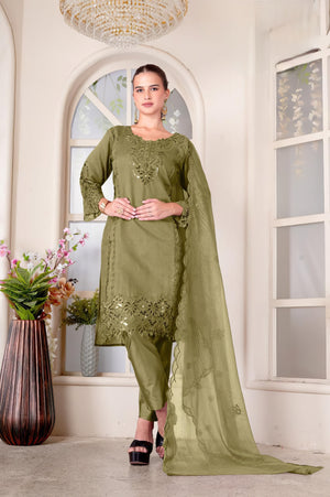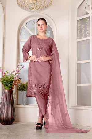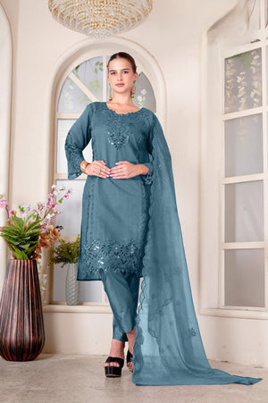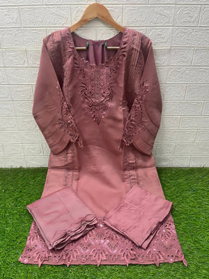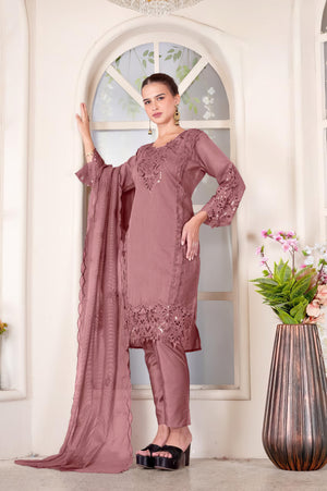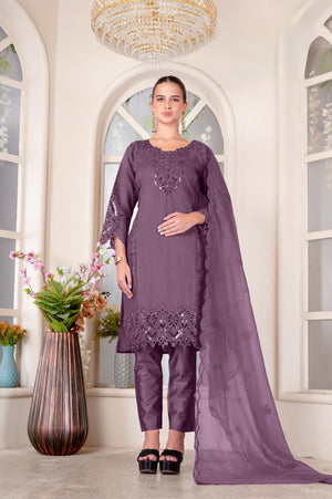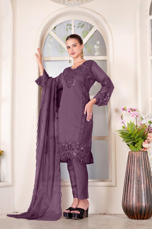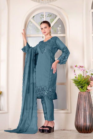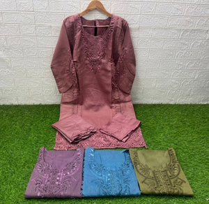This stylish designer tunic features classic embroidery with lace and patterned detailing on the kurti, paired with glamorous embroidered sleeves. The set includes comfortable Gadhwal pants and a delicate Kota lining dupatta with embroidery, creating an elegant ensemble perfect for festive occasions, parties, and semi-formal events. The kurti has a length of 40–41 inches for a graceful fit.
