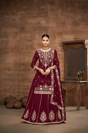 This fully stitched lehenga set is crafted in rich vichitra silk, known for its subtle sheen and smooth drape. The top features elegant embroidery work that enhances its festive appeal, while the flared lehenga offers a graceful silhouette with comfortable movement. Completing the look is a matching vichitra silk dupatta with embroidered borders, making it a perfect choice for celebratory occasions.