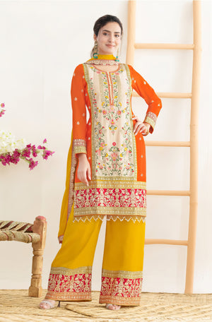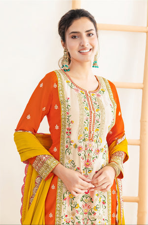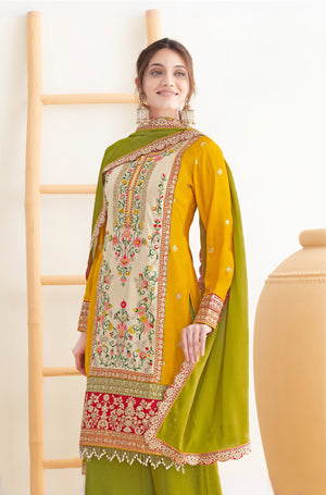 This luxurious set is crafted from the finest Chinnon fabric, adorned with intricate dabka dori and sequin embroidery, enhanced with delicate handmade mirror work. The top radiates elegance with its detailed craftsmanship, while the embroidered plazo ensures a graceful flow. The premium dupatta, finished with four-side embroidery lace, adds a regal charm, completing this timeless ensemble.
