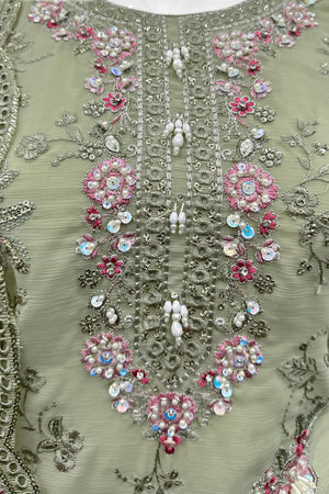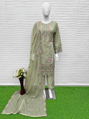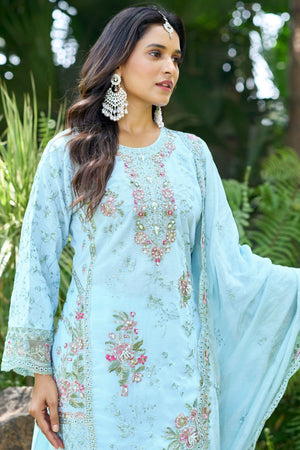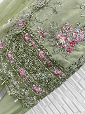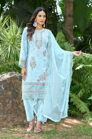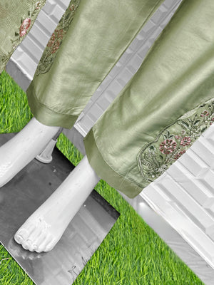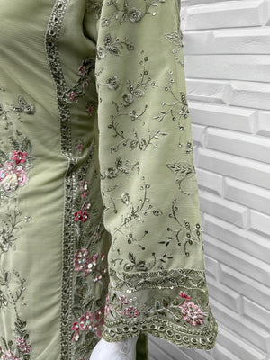 This designer ensemble features a chiffon top intricately adorned with sequin embroidery, boring, laser work, cut work, and elegant lace finishing. The full cotton inner ensures comfort while providing a structured fit. The sleeves are heavily embroidered, showcasing fine boring and cut work details. It is paired with a viscose cotton pant featuring unique patch and palate work. The set is completed with a finely embroidered cut work dupatta for a refined, sophisticated look.