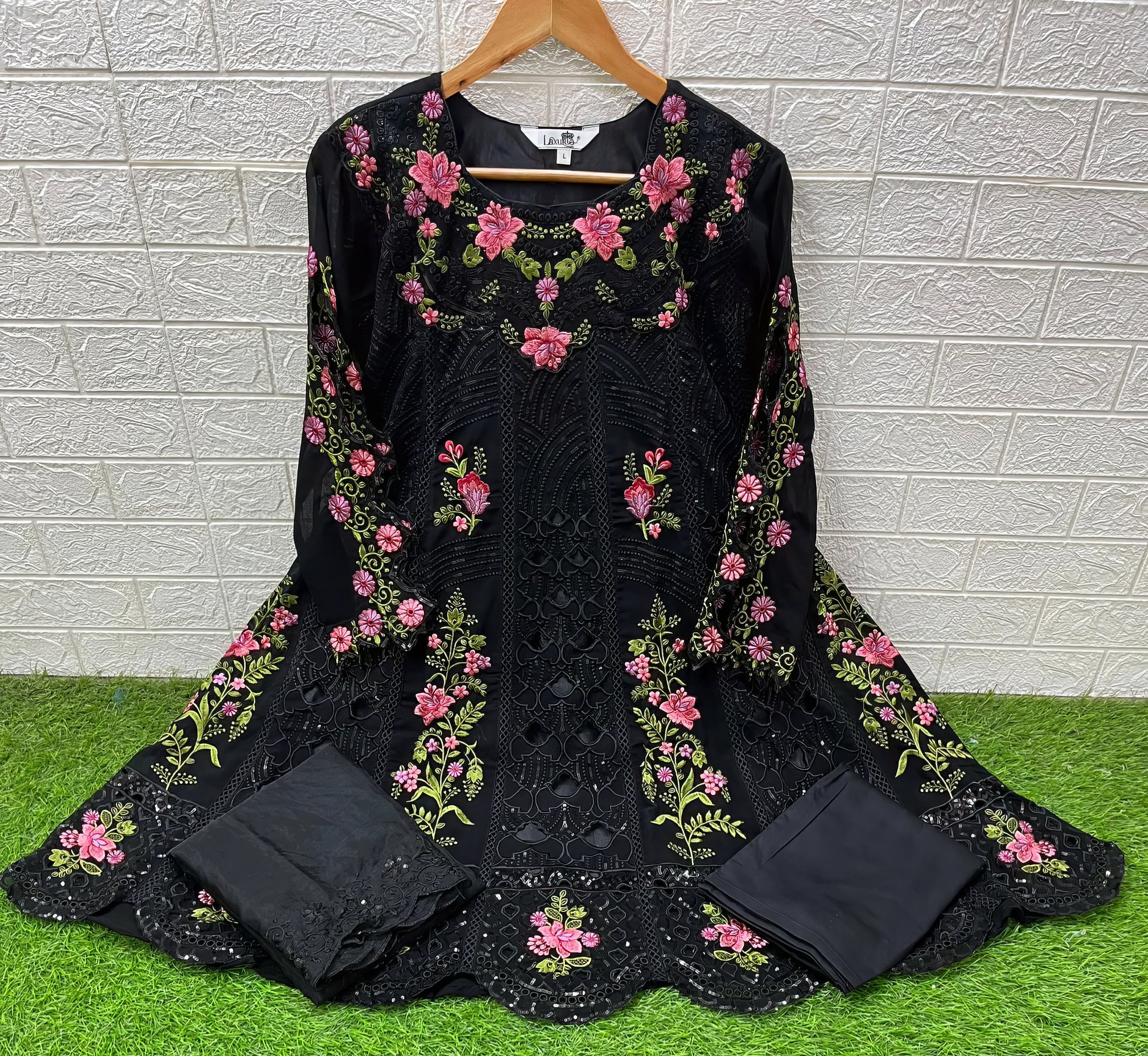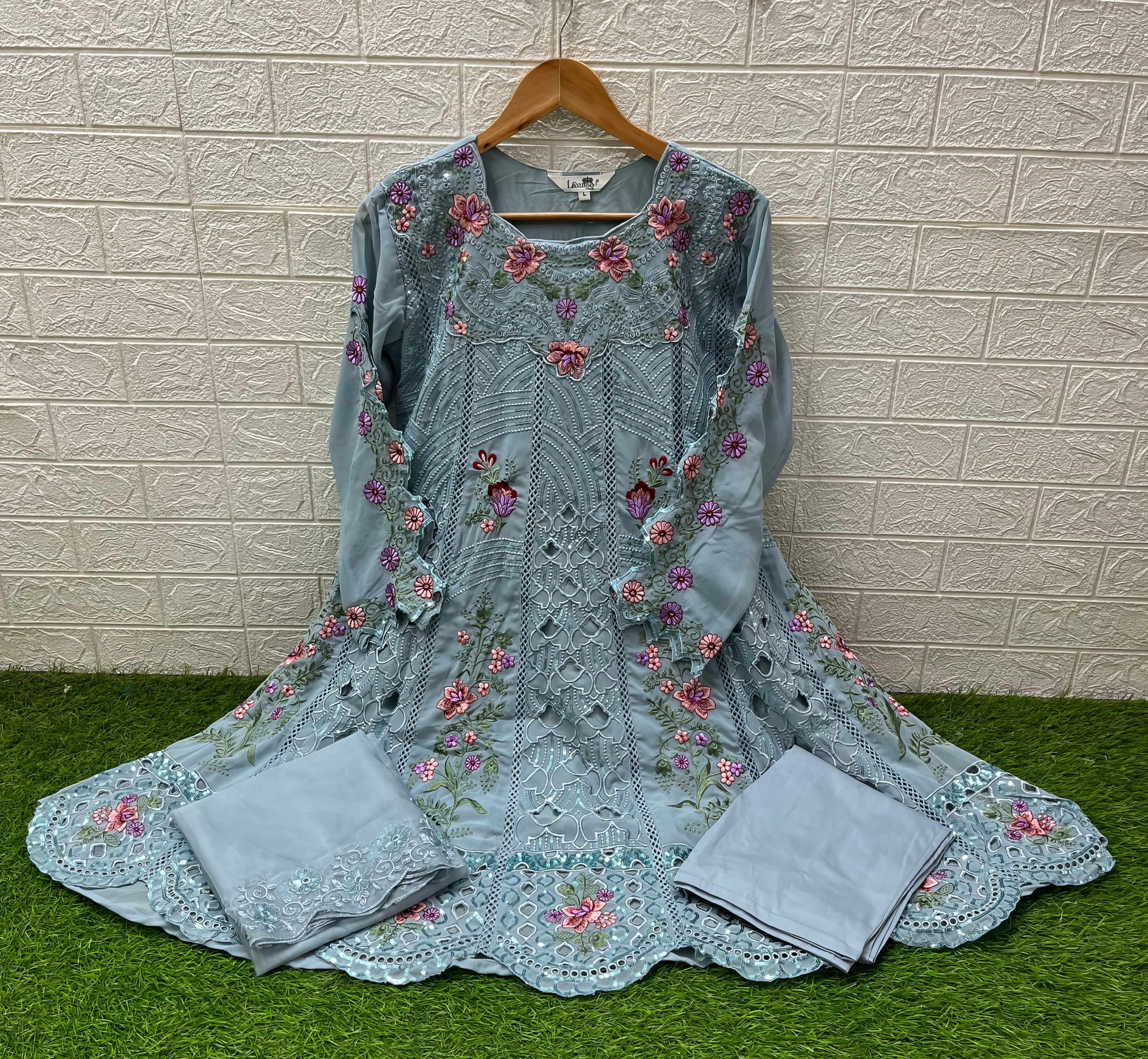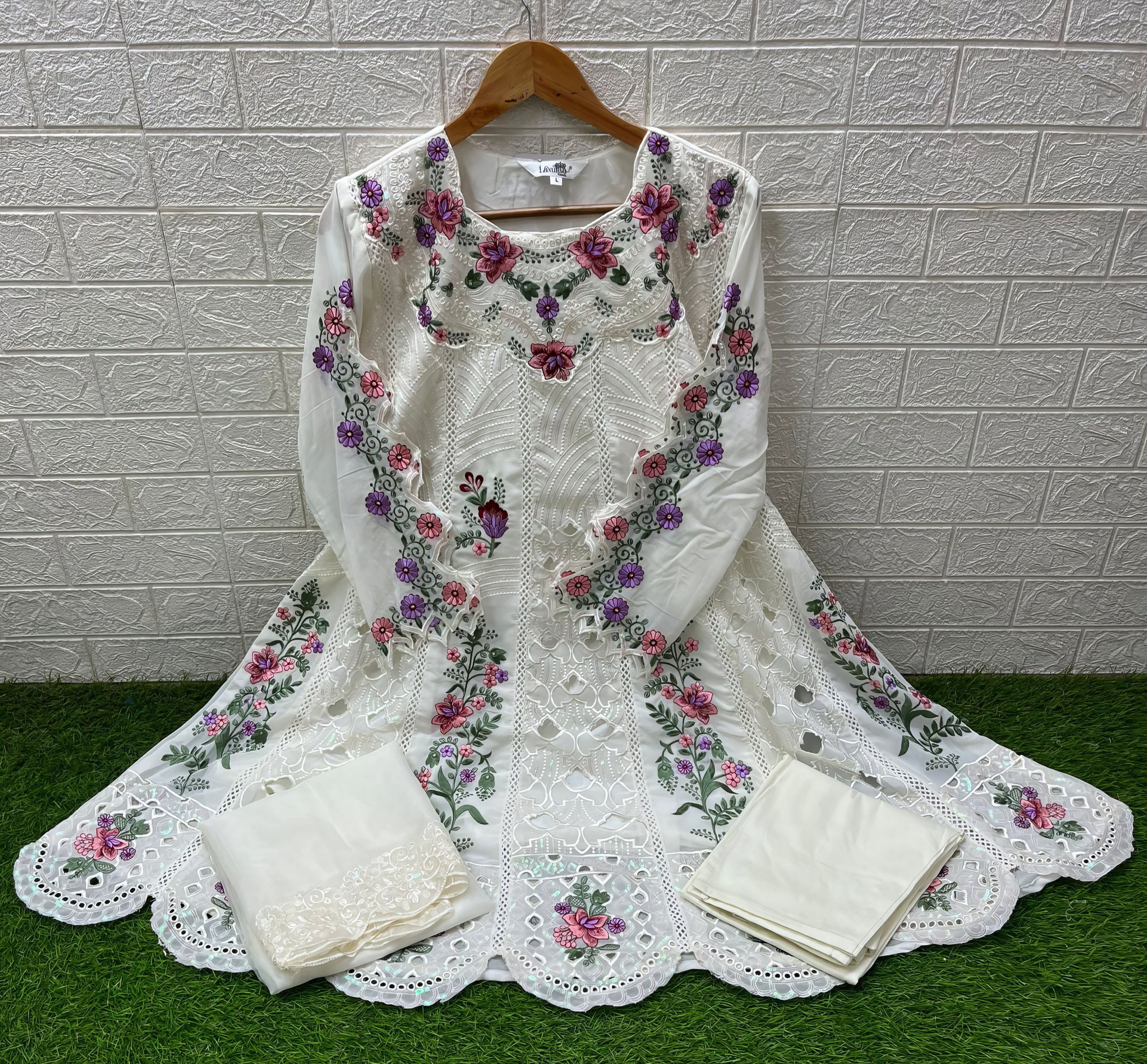 This designer frock-style tunic features classic heavy embroidery for a statement look. The kurti is styled with glamorous embroidered cutwork sleeves, paired with comfortable cotton lycra pants. The set is beautifully completed with a graceful organza dupatta, creating an elegant and fashionable ensemble.