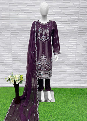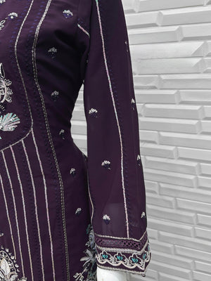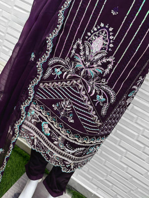 This elegant set features a chiffon top paired with matching embroidered sleeves and a comfortable full cotton inner. The look is elevated with a heavy cotton stretchable pant for a flattering fit. The ensemble is completed with a chiffon dupatta adorned with rich multi-sequins embroidery, perfect for adding sparkle to any occasion.
