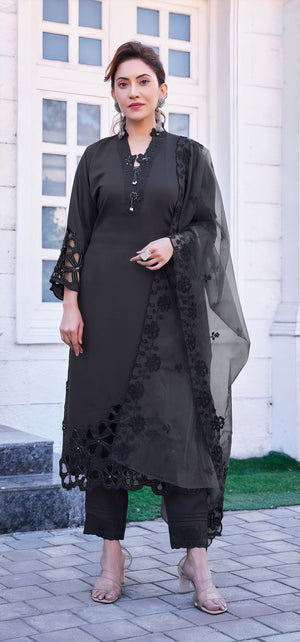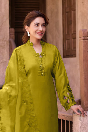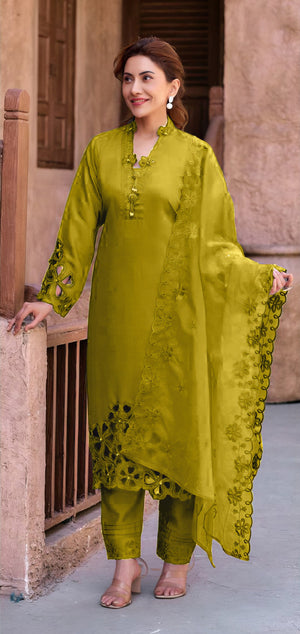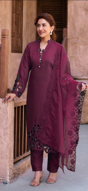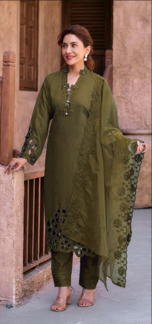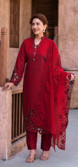 Dupatta: Made from Heavy Organza, adding a touch of sheer elegance and festive flair to the ensemble.