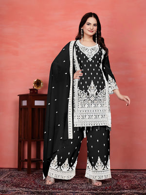 This ready-made ensemble features a luxurious Fox Georgette top adorned with intricate full embroidery and exquisite Khatli handwork, finished with beautiful attached latkans for added elegance. It is paired with a matching Georgette plazo showcasing detailed hand embroidery. The look is completed with a Pure Heavy Georgette dupatta designed with delicate embroidery to enhance the entire outfit.