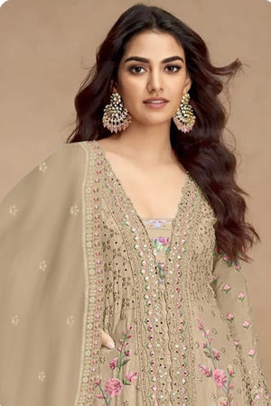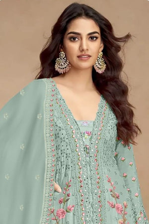 Shine with grace in this stunning readymade Georgette suit, embellished with zarkhan diamonds, intricate embroidery, and premium finishing.