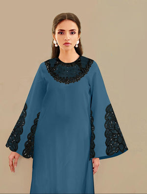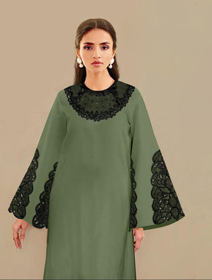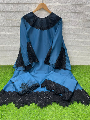 This designer frock-style tunic showcases classic heavy sequin embroidery for a rich festive look. The kurti is paired with glamorous bell sleeves featuring embroidered cutwork detailing. The matching pants also carry intricate cutwork embroidery, while the organza dupatta completes the set with shimmering sequin embellishments.