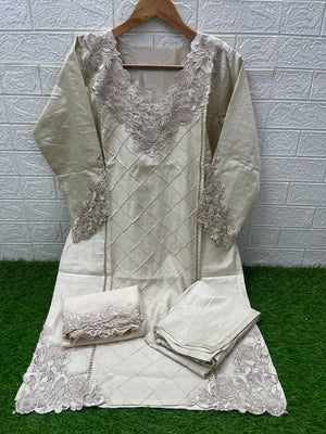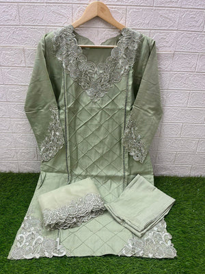 This designer tunic features stunning heavy embroidery with intricate cutwork and fine plating on the tunic and sleeves, adding a rich and glamorous appeal. Paired with a matching pant and a beautifully embroidered organza dupatta, this ensemble is perfect for making a statement at any event.