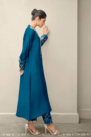 This designer tunic set features a classic satin kurti adorned with elegant embroidery and handwork on the front and sleeves, offering a graceful and polished appearance. It is paired with matching satin pants and an embroidered organza dupatta, completing the look with sophistication and charm.