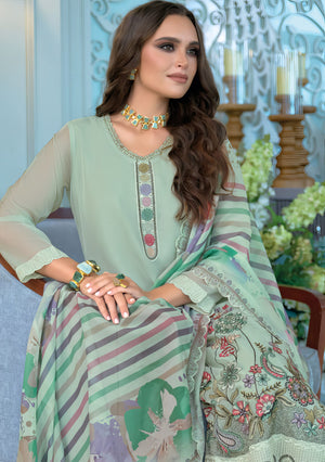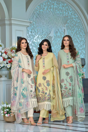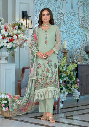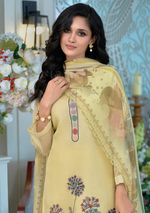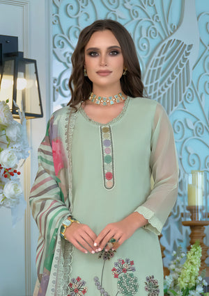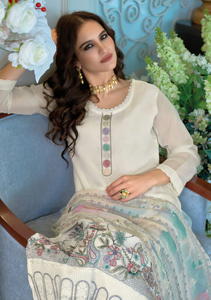 This elegant ensemble features a soft organza top adorned with intricate embroidery, creating a refined and graceful look. It is paired with a luxurious heavy silk bottom and a digitally printed organza dupatta that adds a modern artistic touch to the overall design.