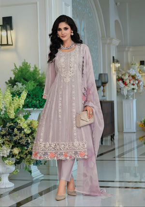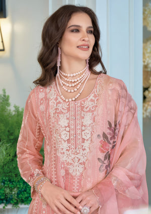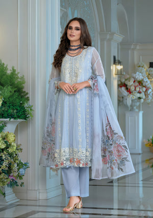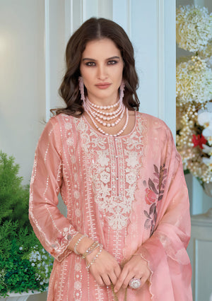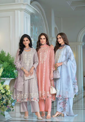 This designer set features a soft organza top with elegant embroidery work, offering a refined and graceful look. It is paired with a luxurious heavy silk bottom and a digitally printed organza dupatta, creating a perfect blend of traditional charm and modern design.