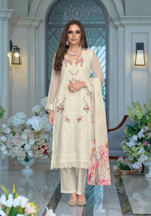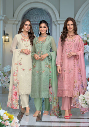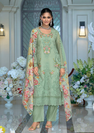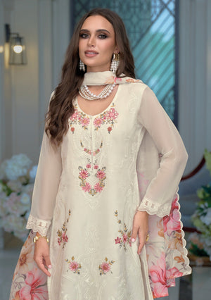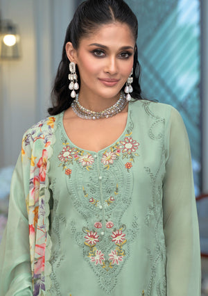 This stylish set features a beautifully embroidered soft organza top that adds a touch of elegance and sophistication. It is paired with a rich heavy silk bottom and a digitally printed organza dupatta, blending traditional artistry with contemporary flair.