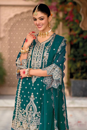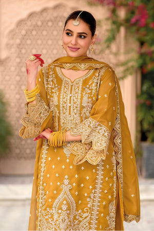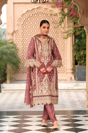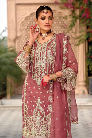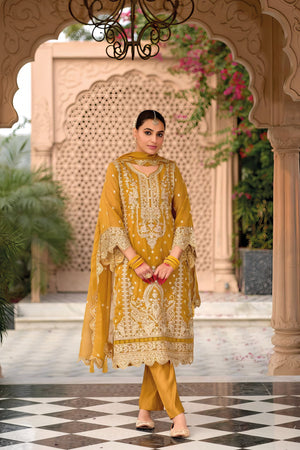 Upgrade your festive wardrobe with this elegant three-piece set crafted for timeless grace. The top features soft organza fabric, delicately enhanced with intricate embroidery that adds a touch of refined elegance. It is paired with a rich, heavy silk bottom that brings both comfort and luxury to the outfit. Completing the ensemble is a soft organza dupatta adorned with coordinated embroidery, adding charm and sophistication. This set is perfect for festive occasions, traditional functions, celebration events, and family gatherings.