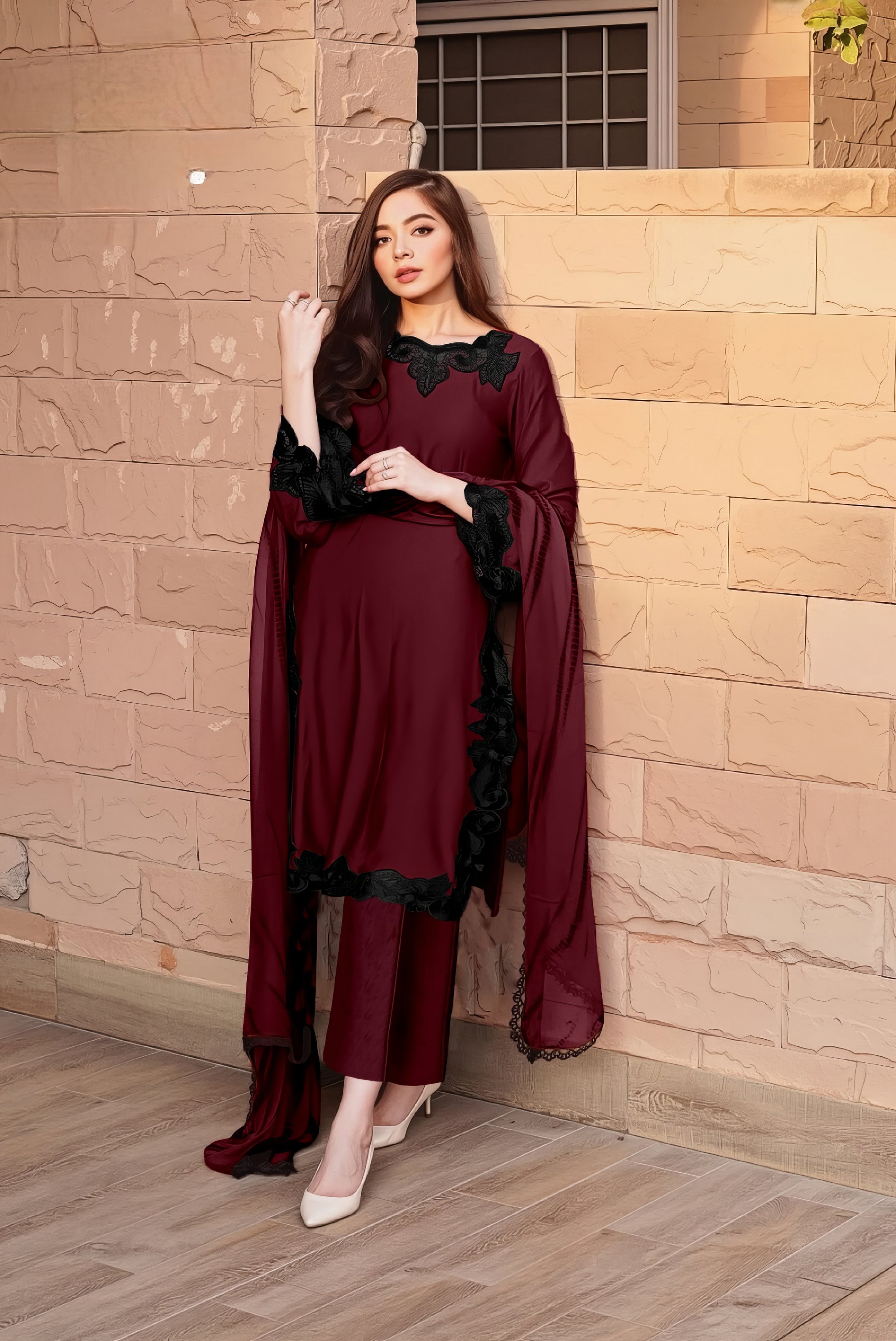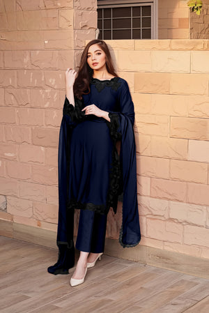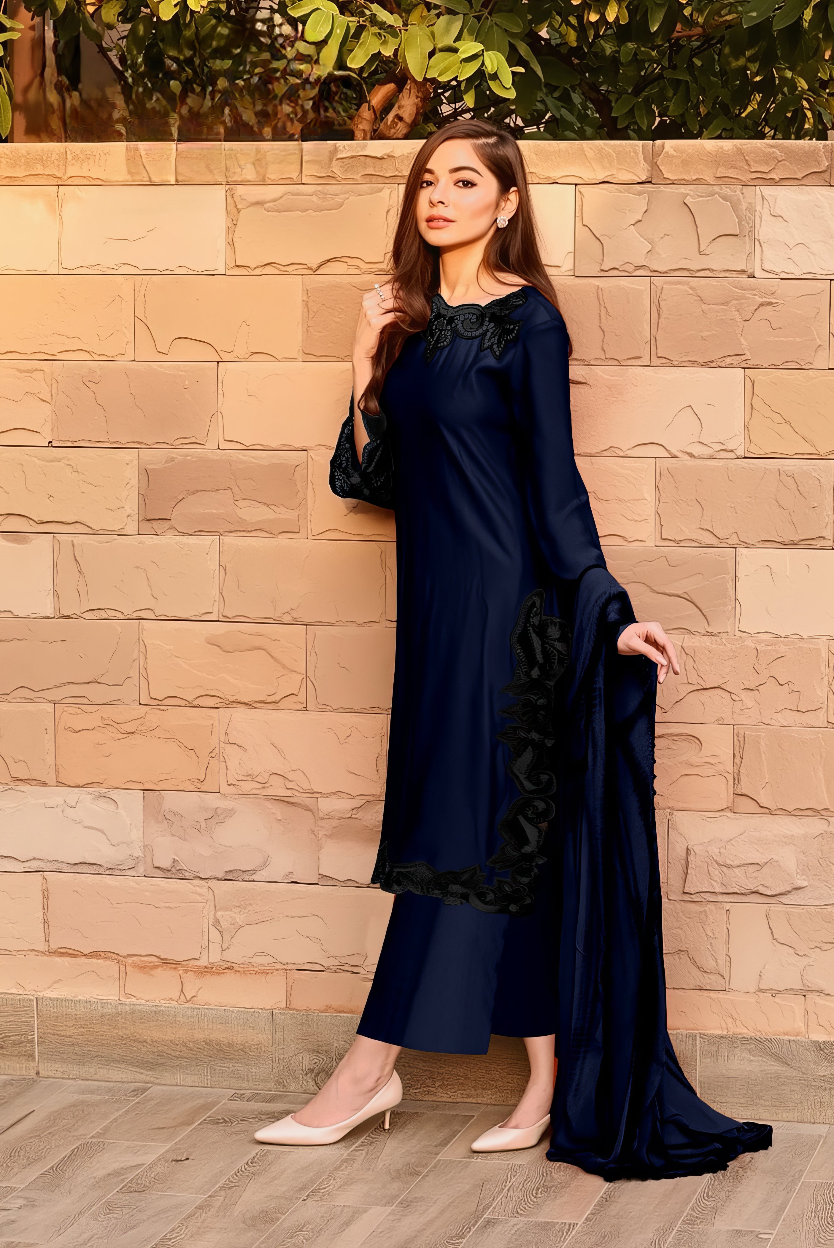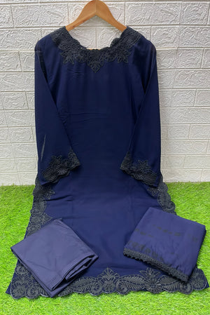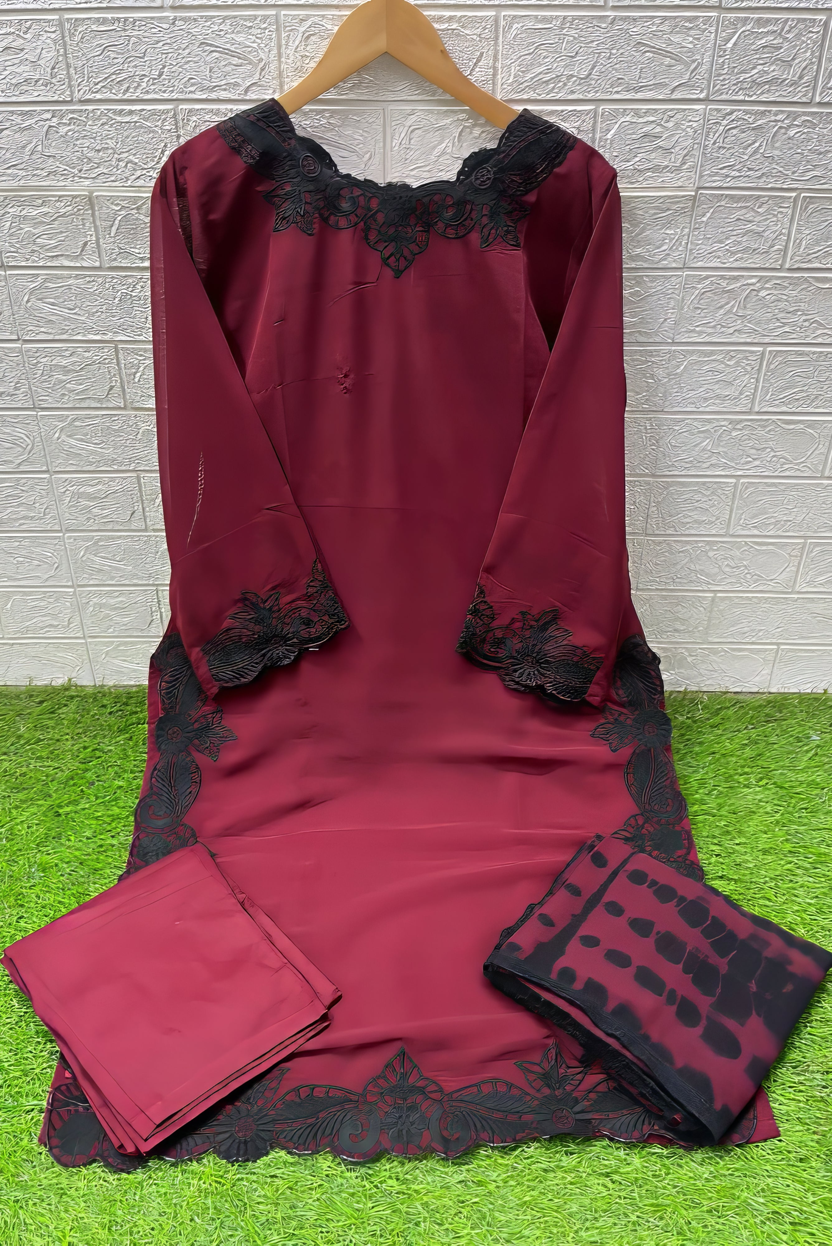 This designer stylish tunic is crafted with classic embroidery and cutwork on the kurti, paired with glamorous embroidered sleeves for a refined look. The set comes with comfortable cotton lycra pants and is beautifully finished with a georgette dupatta detailed with Shibori lace, adding elegance and charm to the ensemble.