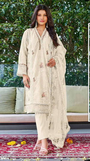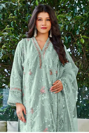 This elegant suit features a premium Fox Georgette top embellished with intricate embroidery and sequence work. The Santoon bottom and inner lining ensure comfort and a smooth fit. Complemented with a heavy net dupatta adorned with embroidery, this ensemble is perfect for festive occasions, parties, and wedding events.