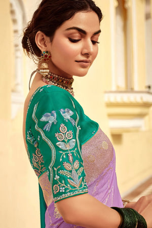 This exclusive designer saree is crafted from luxurious fancy fabric and adorned with intricate embroidery along the border and body, adding a touch of elegance and sophistication. The detailed craftsmanship brings out a contemporary ethnic charm, making it a perfect choice for standout festive looks and special occasions.