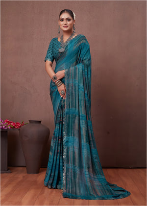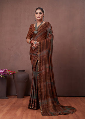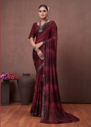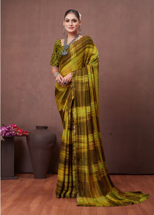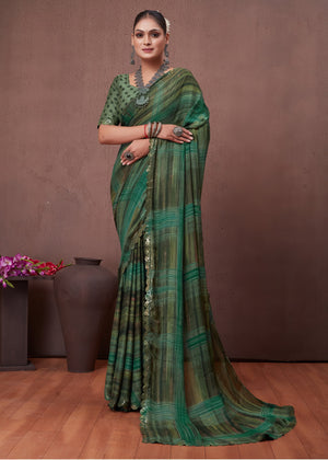 This premium saree is crafted in soft moss fabric and features intricate sequence cutwork that adds a rich, designer touch. The lightweight texture and elegant shimmer make it a perfect choice for both day and evening events. The detailed cutwork along the borders gives the saree a refined and graceful appearance, ideal for special occasions.