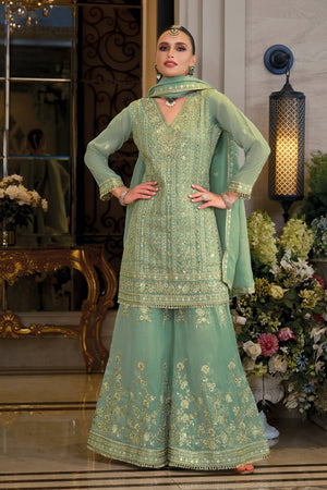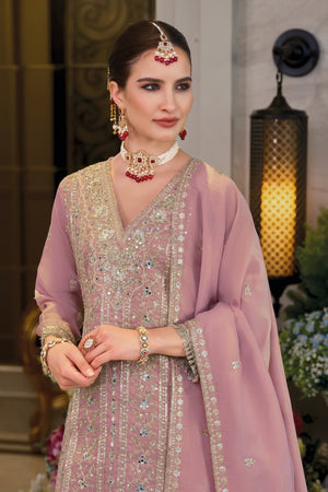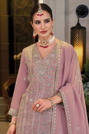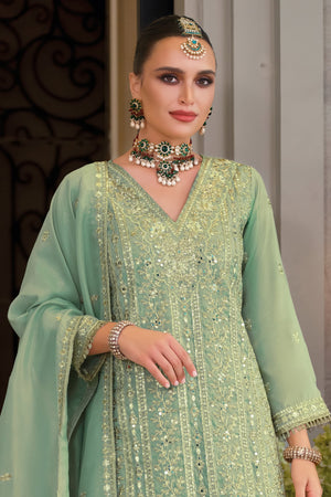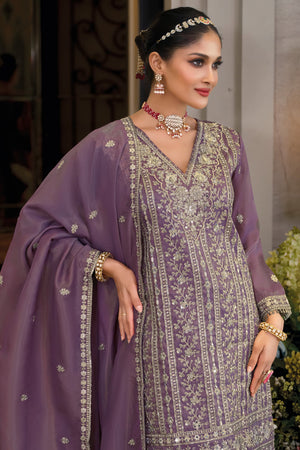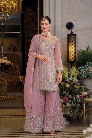 This premium set is crafted in luxurious heavy chinon fabric, showcasing detailed embroidery for a rich and elegant appeal. The top is highlighted with intricate embroidery work, while the matching plazo features heavy embroidery on both the front and back, adding sophistication with comfort. The chinon dupatta, digitally printed and enhanced with embroidery, completes the outfit with a perfect fusion of tradition and contemporary style.
