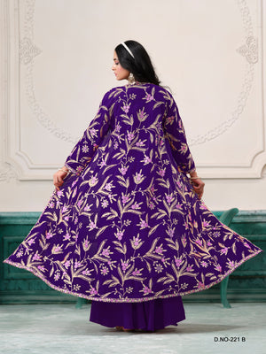 Crafted in soft Faux Georgette, the long jacket-style top features exquisite floral embroidery, offering a regal and modern appeal.