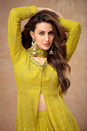 Grace takes center stage in this regal Real Georgette ensemble, detailed with rich embroidery and delicate handwork. With both front and back embellished, and a full-stitched sharara for flowing grandeur, this set is made for celebrations that call for elegance beyond the ordinary.
