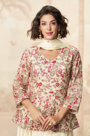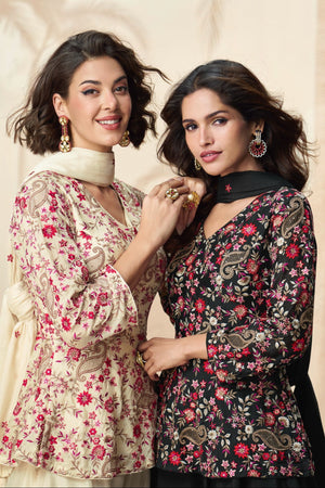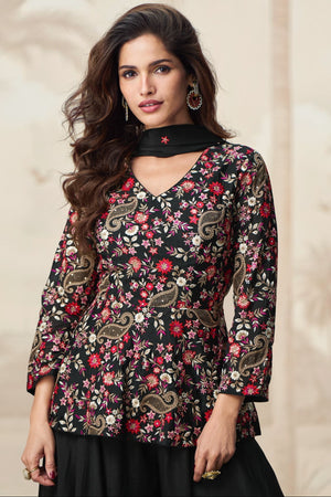 Sharara: The Free Size Sharara in matching Premium Fiber Chinon mirrors the top with digital print and embroidery on both front & back, creating a rich and coordinated look.