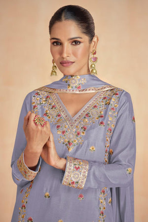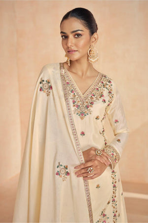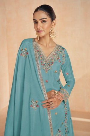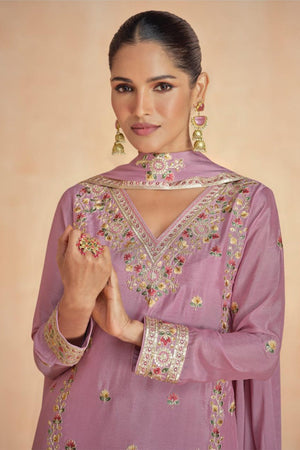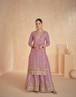 Step into refined tradition with this luxurious Chinon Silk Sharara set, graced with delicate embroidery for an effortlessly regal look.