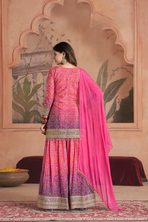 • 1 Sharara Plazo (Premium Chinon – Bandhani Print with Front & Back Work – Free Size)