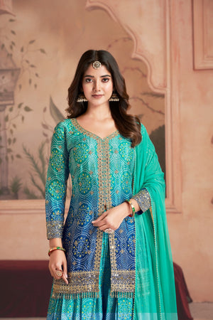 A fusion of heritage and sparkle—this Bandhani digital print Chinon set is elevated with dabka, sequins, and handcrafted jharkan & mirror detailing for a truly festive ensemble.